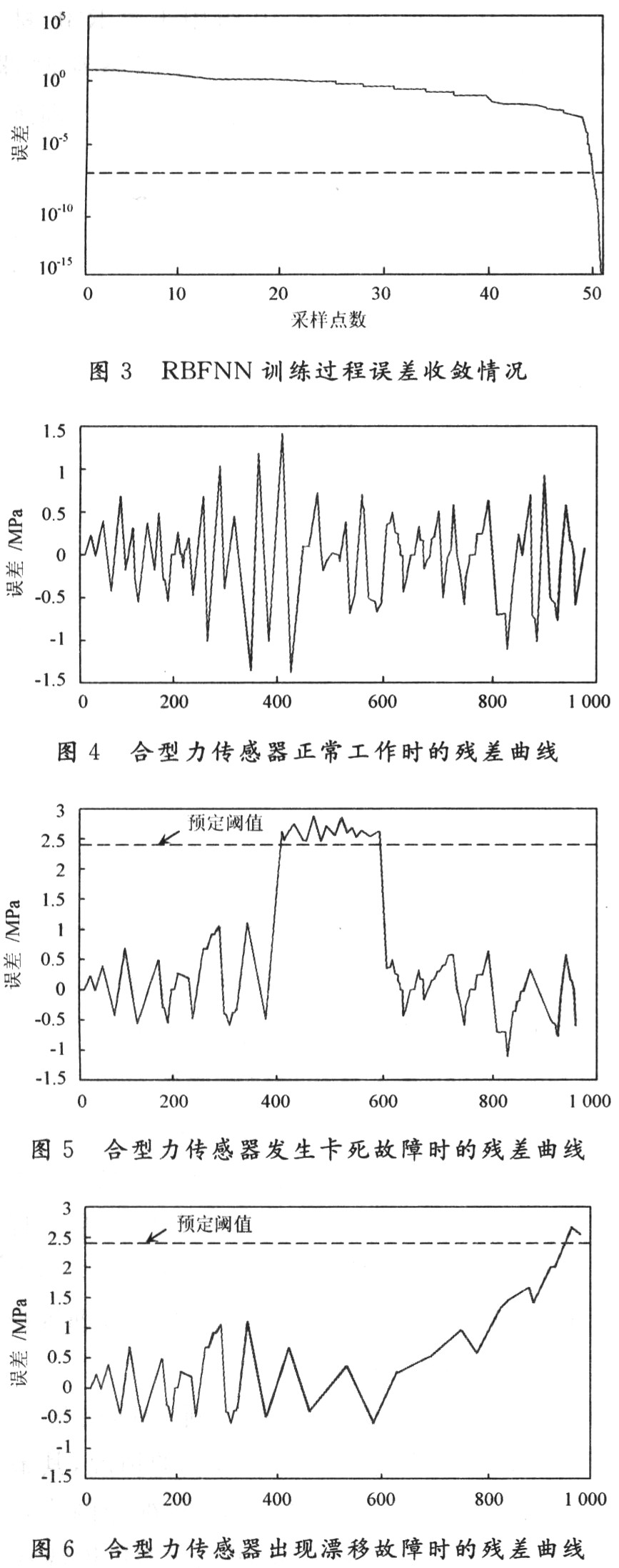 由于表1中的4个参数的物理意义、量级各不相同,必须经过归一化处理后才能用于神经网络的训练,用Mat-lab的Simulink仿真工具箱提供的函数对数据进行归一化处理使数据位于[-1,1]之间。训练结束后切断学习过程使网络处于回想状态,将系统实际输出与网络模型的输出相减就可以获得残差。以合型力传感器" title="力传感器">力传感器为例,采样时间为O.5 s,利用上面的学习样本在时间T∈[1 s,1 000 s]内对RBF神经网络进行训练,结果经过约50步训练误差就达到10_并急剧减少,如图3所示。