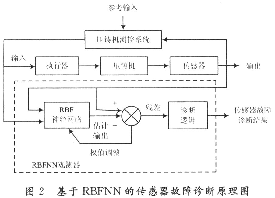 图2中虚线框所示部分即为RBFNN观测器原理。基本思想:通过正常情况下非线性系统的实际输入和传感器的输出学习系统的特性,用已经训练好的观测器的输出于实际系统的输出做比较,将两者之差做残差,再对残差进行分析、处理,得到故障信息,并利用残差信号对传感器故障原因进行诊断。