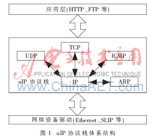 uIP协议处于网络通信的中间层,其设计重点放在IP(网际互联协议)、ICMP(网络控制报文协议)和TCP(传输控制协议)的实现上, UDP(用户数据报协议)和ARP(地址解析协议)实现只是作为可选模块。其体系结构[2]如图1所示。