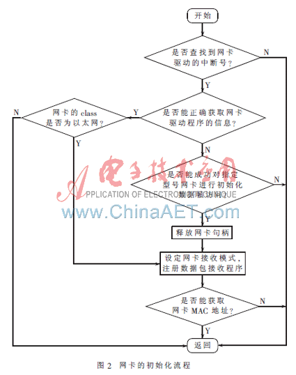 网卡的初始化接口函数int tapdev_init(void),主要完成获取网卡句柄和Packet Driver[4-5]提供服务的软中断号、注册网络数据包的接收程序。函数流程如图2所示。