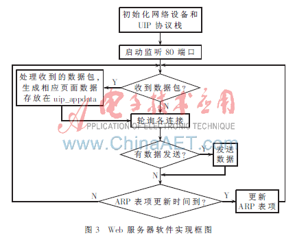 用户只要通过标准的浏览器输入相应的IP地址就可以查看服务器提供的Web网页。Web服务器软件实现框图如图3所示。