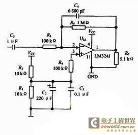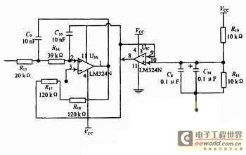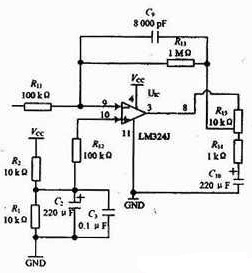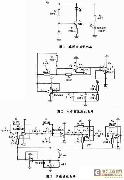 心音和脉搏传感器输出的信号微弱并往往夹杂着噪声干扰,所以必须要进行滤波和放大处理,由于是交流放大器,所以在信号调理电路中选取了电源电压范围宽,静态功耗小,可单电源使用,价格低廉的集成运放LM324。