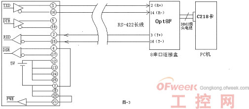 这里,也可以选用MOXA系列C168卡,不过它的8串口是RS-232口,需外加长线收发器将 RS-422转为RS-232后才能连到8串口上,连接方式同图-2。