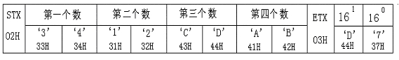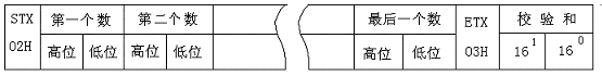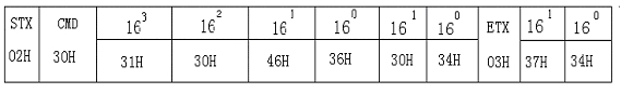 校验和是报文内CMD和ETX中间(包括CMD和ETX)各字节之和,上面报文校验和=30H+31H+30H+46H+36H+30H+34H+03H= 174H,取后两位74H,即为校验和,用ASCII码表示就是:37H和34H。
