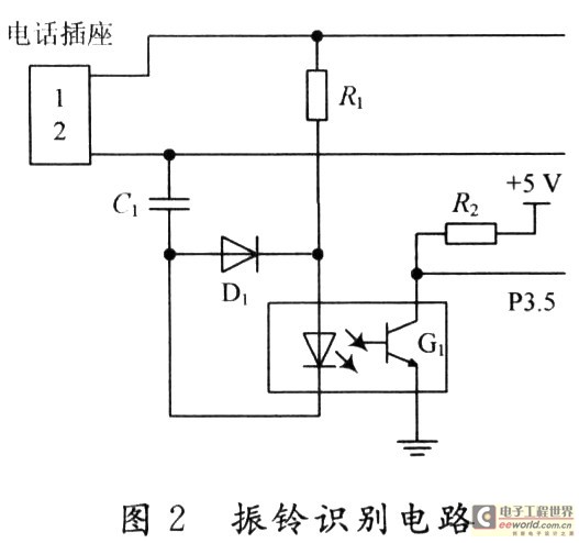 由于电容器C1不能通过直流电压,因此在待机状态下电路没有电流通过。当有振铃时,铃流电压使G1内部的光敏三极管导通,此时P3.5点(连接单片机P3.5口)电压降为0 V;当没有铃流信号时,P3.5点电压为高电平VCC。由此可见,P3.5点的脉冲是随着铃流信号的出现而出现的,因此只要检测到P3.5点有低电平脉冲出现,就说明线路上有铃流信号了,而且P3.5点在单位时间内出现的脉冲个数就代表了振铃时间的长短,通过累加P3.5点的脉冲个数就可以判断出振铃时间的长短和铃响次数的多少。