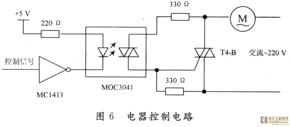 由于双向可控硅可以实现小功率直流电控制大功率交流电的功能,因此本系统采用它控制家用电器的开关。电器控制电路如图6所示。