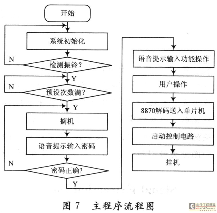 本系统软件设计采用模块化设计,主要单元功能模块包括振铃检测计数、控制摘挂机、密码校验、双音频信号分析处理、控制电器、信号音提示等。主程序流程图如图7所示。