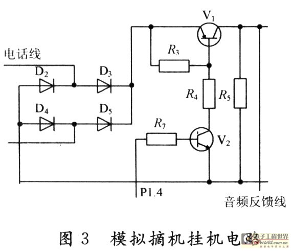 摘机、挂机电路其实就是一个电子开关,控制电路板和电话线之间的连接。平时这个开关应该处于断开的状态,以免造成电话线占线;当需要实现远程控制时,如果振铃响五次而无人接听,这时候就需要让电路板和电话线路接通,即完成摘机动作。模拟摘机挂机电路如图3所示。V1就是一个电子开关,该开关的导通与否受到单片机P1.4口的控制。