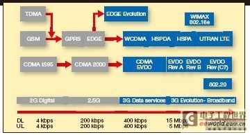 与此同时,网络运营商正在继续铺开3G宽带CDMA(WCDMA)网络。基于通用移动通信系统(UMTS)的网络拓扑架构,这种新技术正迅速成为引领全球移动宽带的解决方案。行业分析家预示WCDMA和EDGE将在未来几年代表手机市场的两个发展最迅速的部分。而且,为了满足基于IP的服务需要,全世界正增加的UMTS运营商正在部署高速下行链路数据分组接入(HSDPA)网络。高速上行链路数据分组接入(HSUPA)也将在不久后开始部署。图2给出了每个手机标准和相关上下行链路数据传输率。