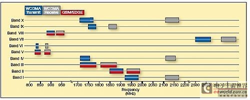随着这些新型应用需求的上升和市场变得日益全球化,手机生产商陷入了困境。他们怎样才能在不违背市场严格的成本、覆盖区和功率制约的情况下维持不断增长的用来支持全球平台和需提供这些新的增收服务的多路宽频带技术的频带数量?最新的3GPP标准支持的频率数量已经从3个增加到了10个并且被设置可继续扩展。目前的频谱和相关带宽如图1所示。