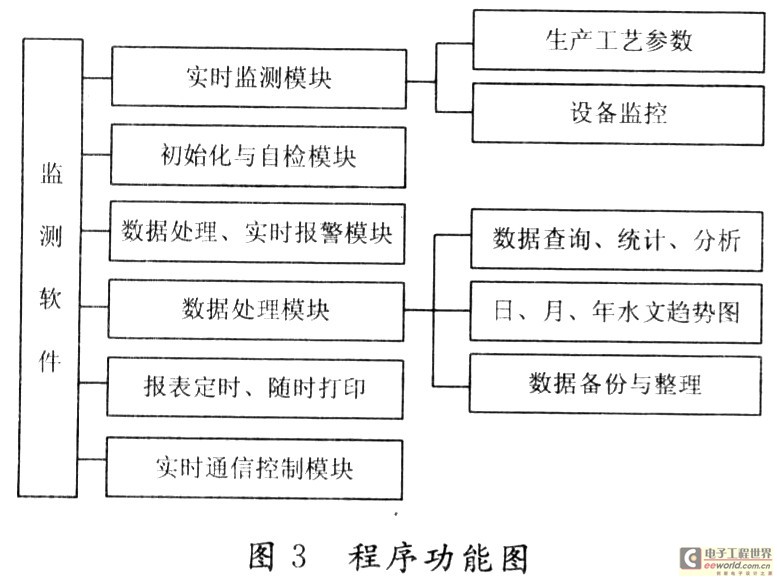 为了将系统集成为具有测量、控制、管理功能于一体的测控系统,在车间级的Intranet中集成了生产在线数据库以及控制参数与工艺数据库服务器,生产在线数据库服务器主要用于管理当日当班的人员、计划调度以及生产完成情况,工艺数据库服务器主要用于记录生产工艺参数、重要工段以及重要设备的定时抽检数据、故障几率等,便于了生产管理。整个程序的设计功能见图3。