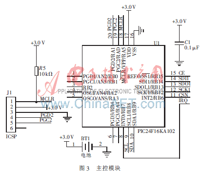 主控模块采用Microchip公司型号为PIC24F16KA102的16 bit超低功耗单片机。该系列的MCU采用nanoWatt XLP(eXtreme Low Power)极低功耗技术,其典型休眠电流可以低至20 nA,实时时钟电流低至490 nA,看门狗定时器电流低至370 nA[3]。MCU可连续运行20年以上而无需更换电池,成为业界8 bit和16 bit MCU中低功耗性能最突出的MCU。该单片机具有SPI、I2C、UART、9个模拟输入通道、3个16 bit定时器/计数器、3个外部中断[3],完全可以满足有源标签的需求。MCU与标签通过SPI接口进行串行通信,如图3所示。图3中的J1是PIC 24F16KA102单片机用于下载和调试程序所用的ICSP接口。