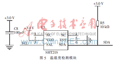 SHT21S[5]是瑞士Sensirion公司的温湿度传感器,体积小、功耗低、稳定性好。该温湿度传感器在25℃时的温度测量精度为±0.3℃,温度响应时间为5 s~30 s(τ63%);湿度测量精度为±2.0% RH,湿度响应时间为8 s(τ63%)。该芯片通过SDM接口与MCU进行通信。温湿度的测量通过SCL(3脚)来选择,当SCL输入高电平时进行湿度的测量;SCL为低电平时进行温度的测量。也可以在SDA引脚外接一个低通RC滤波器将SDM信号转换为模拟电压输出。温湿度检测模块如图5所示。