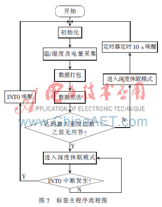 为达到超低功耗的目的,标签有两种工作流程:(1)正常的工作流程,检测出所需的物理量并打包发送,时间间隔是10 s(在程序中可自行设定)一次,每发送完一次即进入深度睡眠模式,达到10 s后通过定时器唤醒,唤醒后程序从复位向量处重新执行;(2)进入深度休眠状态,通过外部中断0(即INT0,外接nRF24L01的中断请求IRQ)进行唤醒,唤醒后重新从复位向量处执行。标签主程序流程图如图7所示。
