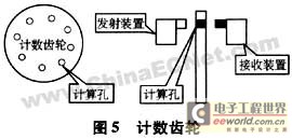 传感器9置于机器人正后方的光电码盘,用于计里程,借助于鼠标原理,选用直径为2.6 cm的塑料小轮自制光电码盘,经过打磨使其周长为8 cm,再在该小轮上打等距离的8个孔,如图5所示。最小测距精度可达到1 cm,足以满足要求,两侧装上光电传感器,将其安装在车尾,使之与车的行驶同步。就实际情况自制出来的各个孔之间的距离无法精确相等,但经过具体测量该光电码盘,能保证行驶50 cm产生50个脉冲,于是采用其作为计算距离的基准单位。在直道区,可由该电路产生的脉冲数,计算出铁片中心线至起跑线间的距离。