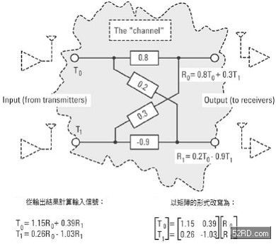 它看起来且实际上也比传统的无线电系统复杂,但最大的好处是不需使宽,也不需具备更佳的信号/噪音比,就能够以高出很多的速率传送资料。以一个方形矩阵A 来说,其单数值是AHA 特征值的方根,其中AH 是A 的共轭转置(Hermetian)。最简单的方法就是把单数值想成可以用来衡量空间通道有多强及分离度有多好的基准,而最理想的MIMO 通道特性是单数值够高且大小相等。找出通道系数的方法有几种,请参考图3,最简单的一种就是在T0 和T1 发射一对已知的不同信号,然后量测出现在R0 和R1 的信号。这是一个(non-blind)的已知通道粹取例子,系统运作的(training period)与用来传送使用者资料的时间是截然不同的。这是针对802.11n 的运作所提出的方法,也是802.11a 中所使用之多频(multitone)通道估测法的延伸。在图3 中,T0 和T1 代表透过无线电通道传送的信号,范例中的系数指的是通往R0和R1 接收天线的途中,所出现与频率无关的路径损耗及交互耦合。