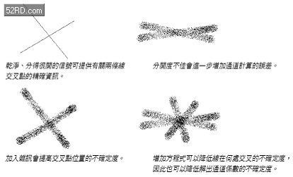 最后,在右下角的图中,加入了更多的线,代表更多的方程式,这是使用更多支天线所产生的。使用更多的线(方程式)有助于提高交叉点位置的部分解析度。