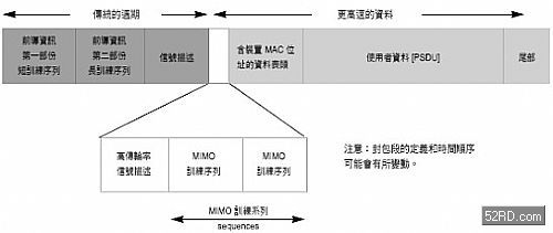 MIMO 通道估测的过程需要延伸802.11a 所使用的前导训练序列(preamble),多出来的训练期间可以让接收装置计算通道的系数。为了建构高传输率的WLAN 封包而提出的一种结构如图5 所示。在丛发信号的资料部份,会将资讯对应到个别的传送通道上。在过程中,会轮换不同天线所使用的次载波。对空间多工(SDM)的运作来说,这其实并非必要的,但可以强化信号的耐受力(robustness)。