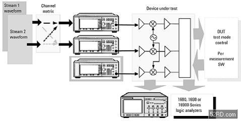 MIMO 接收器处理的是丛发信号中两个主要的部份:通道估测和分开多重通道的资料。在接收器设计的过程中,可以利用发射器测试一章中所介绍的设备,在RF 和(Z)IF 频率分别分辨出丛发信号的这两个部份。图13 显示了测试配置介接点的可能组合,89600 VSA 可以搭配逻辑分析仪以及类比撷取硬件使用。