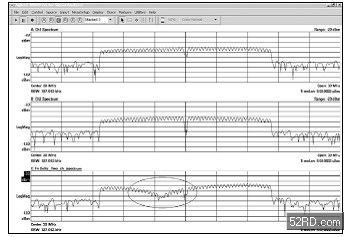 为了避免出现不想要的相位阵列波束成形效应,在送出相同的信号时,会在发射器之间插入小的週期性延迟(cyclic delay)。使用单一通道分析仪来量测合在一起的信号时,所得到的频谱图不是具有高于相对等之802.11a 信号的峰值,就是有明显不平坦的频率响应。图9 的例子来自于一部标准的扫频式频谱分析仪,可以注意到圈起之处就是前导短训练序列的峰值。