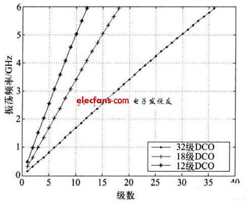 为了研究环形振荡器级数对频率调节范围的影响,将数控振荡器的级数减少至18 级或12 级,再分别测试其频率调节范围。三种不同级数数控振荡器调节范围的对比如图6 所示,不同级数的数控振荡器fmax 相等,但fmin 随着数控振荡器的总级数增加而减小,且KDCO 也变小,调节线性度更好。