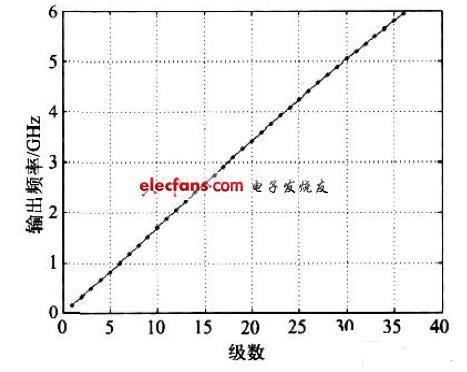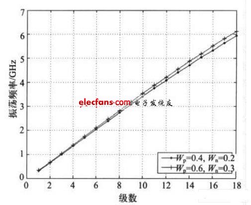 电路中电源电压VDD=1.2V,所有MOSFET 均采用9 0 n m 工艺库中的标准电压晶体管,S V T(Standard Vol tage Tr ansi st or ),其阈值电压为Vthn=0.3V,|Vthp|=0.3V。当32级环形振荡器逐级打开,数控振荡器输出波形的振荡频率也逐级上升,整个数控振荡器的频率调节范围如图4 所示。