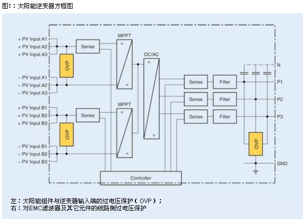 太阳能装置通常装在屋顶等户外位置,也越来越多地装在开阔地带,因而过电压带来的风险极高,而太阳能组件与逆变器(直流电平)之间长长的引线以及接至电网(交流电平)的馈线则又加剧了这一风险。图1为典型太阳能逆变器的结构:将来自太阳能组件的直流电压转换成交流电压,然后供给电网。