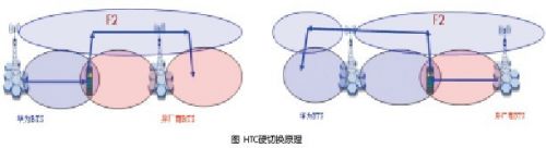 所谓HTC(Huawei Transition Carrier)硬切换方案原理,是利用华为基站多载波特性,在边界基站上增加过渡载波F2;F2没有同频干扰,可以在边界区域覆盖一个足够宽的过渡带;由于F2负荷很低,在硬切换边界有足够高的强度,F2和基本载波之间只存在1次异频硬切换,彻底消除了乒乓切换;对于F2之间,采用软切换或更软切换,有效保障通话质量和切换成功率(如图所示)。