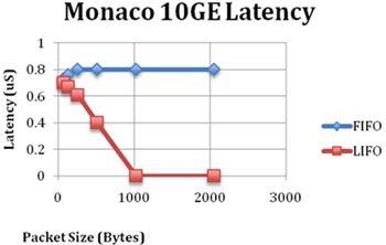 这两种方法从效果上看是相同的,是正确测量通过直通交换机的时延的唯一方法。为了说明这些方法的工作原理以及与LIFO测试的区别,让我们对最近使用Fulcrum“Monaco”10GE交换机做的现场测试结果做一下评估。