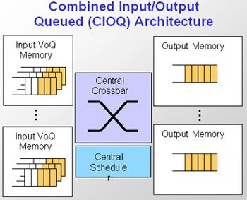 存储器存取带宽一直是交换芯片架构师心头的痛。在使用传统的交叉开关矩阵和内存设计时,将没有足够的片上带宽允许每个输入端口同时写入相同的输出队列。为了解决这种阻塞问题,芯片架构可以在每个交换输入端使用虚拟输出队列,即所谓的组合式输入/输出队列(CIQQ)架构(图1)。