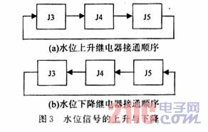 电传水位计是用来监测水位的变化,为了获取水位信号对电传水位计的传感器部分进行了改造。在传感器内部增加了干簧继电器J3,J4,J5,取消内部电池而直接由系统供电。电阻R5~R8组成分压器,分压器输出到ADCIN2口电路如图2所示。当水位变化时浮子随之升降,浮子升降3 cm,传感器内部的磁钢旋转一周,即每变化1 cm有一个干簧继电器会通断一次。J3,J4,J5分别吸合时IN2口的电压分别为1.6 V,2.5 V,3.2 V左右,无继电器吸合时IN2口电压为+5 V.根据ADCIN2口的电压数值可以判断是哪个干簧继电器通断,由IN2端电压变化规律可以知道水位的上升或下降如图3所示,图3中(a)为上升,(b)为下降。
