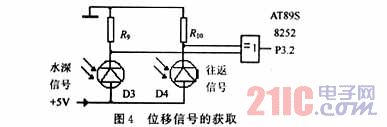 铅鱼的行程信号包括铅鱼水平往返移动的行程信号,和铅鱼测量水深时垂直移动的水深信号。位移信号的获取如图4所示。他是由加装在机械传动装置上的切光板和光电门获得。设计为缆索每移动1 cm切光板遮光一次,光电门产生一个脉冲。水深和往返信号分别从光敏二极管D3,D4上取出,经过异或门后加到单片机P3.2外部中断0输入端,每移动1 cm产生一个中断,中断服务程序可以区别铅鱼此时作水平往返移动还是垂直移动,两者只取其一。