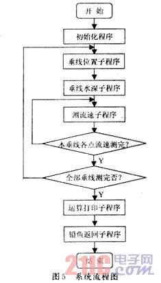 程序分为系统管理、运算处理、测验控制3大模块。系统管理模块包括:初始化、系统监控、操作切换、紧急处理等程序。运算处理模块包括:数据运算、误差修正、显示打印等程序。测验控制模块是由包括:测垂线到起始点距离、测垂线水深、测垂线流速、测垂线水位、接口数据采集等诸多子程序组成。