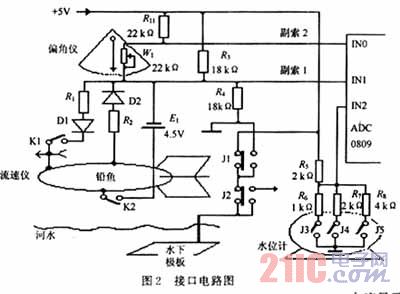 他将电传水位计的水位变化信号和缆道送来的流速、偏角、水面水底信号经变换后传送到单片机。该接口具有电路简单、稳定可靠、抗干扰强等特点。