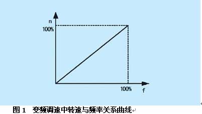 该厂#1~#4机为C60-8.83/1.27型汽轮机,该型汽轮机配备两台12NL-125型凝结水泵,其扬程125M, 流量320T /H,电机功率为180kM,电压380V。异步感应电动机,其转速公式为n=n1(1-s)=60f/p(1-(n1-n)/n1), 可见,只要改变其中任何一个参数都可以实现转速的改变。变频器是通过改变电源频率f的方式来改变电动机转速的。对于某一电动机,转速与频率是线性关系的,如图1所示。