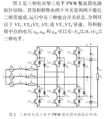 三相电压型两电平PWM 整流器是最基本的PWM 整流电路,因为结构简单、控制算法相对成熟,得到了广泛应用。与其相比三电平PWM 整流器每个桥臂多了两个开关管和两个箝位二极管,电路结构复杂、存在中点电位平衡问题、控制算法繁琐,但因此种电路具有更大的变换功率、更低的输入电流畸变率等优点,也被广泛研究应用。