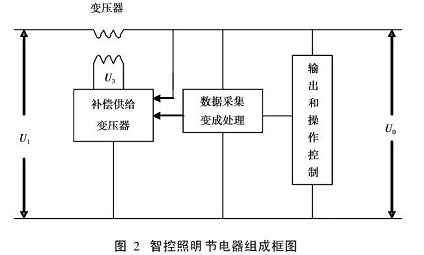 智控照明节电器主要由主变压器、补偿供给器、数据采集与编程处理、输出和操作控制等四大部分组成(见图2)。