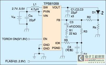 在电源转换领域,DC/DC转换器在为LED驱动与处理器内核电源提供高效率的供电解决方案上扮演着越来越重要的角色。为提高数码照像与视频会议的性能,CMOS与CCD传感器的分辨率在不断提高。随着传感器的分辨率不断提高,要拍出高质量照片就需要更亮的光,这又将需要相机闪光灯更亮的解决方案。当照相手机的分辨率大于100万像素时,至少需要50勒克斯的亮度才能拍出高质量照片。而目前许多手机所能提供的闪光灯亮度都比这低,其闪光灯白光LED的驱动电流还不到100mA,这种设计实际上并不能改善照片质量。为真正地改善照片质量,需要用将近1A的电流驱动高功率白光LED,而使用电荷泵是难以提供1A的电流,因为此时的电池电流将达到2A,将超出系统为此类功能预留的任何电池功率预算。为解决电池电流过大的问题,图3给出的高效率DC/DC升压转换器,可为相机闪光灯应用的白光LED提供高达700mA的电流。