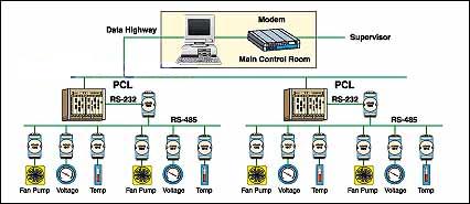 PLC 从 ADAM 模块读取数据并把它通过 RS-485 网路发送到中央控制室。RS-485 网络,以其简单的双绞线结构,对于要求容易安装的应用来说是理想的选择。
