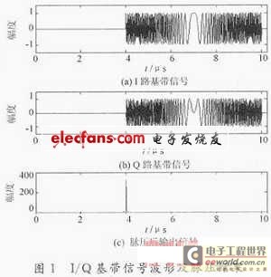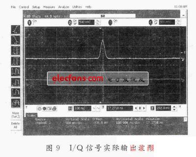脉冲压缩系统软、硬件调试完毕之后,通过板上的D/A输出可以直接监测脉冲压缩后的I/Q信号波形,如图9所示。