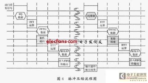 IFFT运算的处理单元和FFT的处理单元采用相同的结构来实现。具体的实现方法是,在做IFFT运算前,先交换输入数据的实部和虚部,然后送入FFT处理单元按照FFT结构进行运算,得到运算结果后,再对其实部和虚部进行交换,然后除以运算点数1 024,就可以得到IFFT后脉冲压缩的运算结果。