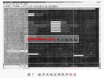 利用ModelSim仿真软件首先对程序代码进行时序功能仿真,完成逻辑的综合与实现之后再进行布局布线后仿真,此时的仿真已基本接近真实情况。综合后的仿真情况如图7所示,仿真结果表明软件运行正常,可实现线性调频信号的脉冲压缩。