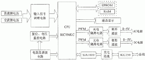 系统硬件设计包括现场测控节点的设计和CAN接口适配卡的设计。现场测控节点作为现场数据采集与控制层完成的功能包括:对各状态量的检测;对交直流叠加电源电压的控制,达到直流基压0~60kV,交流峰峰值电压40kV,交流频率16~50kHz;对进入反应器的烟气温度进行控制(60~80℃);对氨注入的控制,准确地控制氨硫摩尔比(不大于2:1)。各个现场测控节点具体的功能可能不一样,但硬件结构大同小异,下面以交直流叠加电源电压测控节点为例进行介绍,其硬件结构图如图3所示。该电路主要包括输入信号调理电路、单片机外围电路、模拟控制信号输出电路、液晶显示电路和 CAN通信电路等。CPU采用Intel公司的16位单片机80C196KC作为微处理器,其内部设有256字节的RAM,带有28个中断源,运算速度快,它本身还带有三路PWM输出和高速输入输出HSI和HSO,尤其适用于快速控制系统。CAN总线通信电路采用Philips公司的SJA1000独立控制器和82C250驱动器。SJA1000有基本的Basic CAN和增强的Peli CAN两种模式,全面支持具有新功能的CAN2.0B协议 [4]。82C250可以提供总线的差动发送和接收功能,提高系统总线的节点驱动能力,增大通信距离、降低干扰。控制单元采用高速光耦6N137隔离各个前后通道,被隔离部分分别使用不同的电源和地线,以提高抗干扰性能。