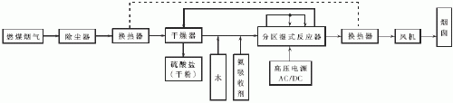 流光放电等离子体烟气脱硫的原理是利用高频高压交直流叠加电源使反应器发生电晕放电,放电产生的高能激发电子电离烟气中的气体分子(O2、 H2O、N2等),产生极富氧化性的离子和自由基,这些活性粒子在有添加剂NH3存在的条件下通过一系列的链反应将污染物成分(如SO2、NOX等)氧化生成稳定的铵盐,从而达到烟气脱硫的目的。系统工艺流程图见图1。