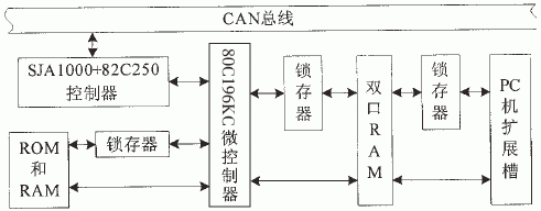 CAN接口适配卡的结构相对比较简单,专门负责在上位微机与CAN总线之间传递消息,其结构如图4所示。从图中可以看出适配卡由微控制器电路、双口RAM电路和CAN通信控制电路三部分组成。有了前面测控节点的设计经验,这里依然选择80C196KC作为微控制器,比较常用的是采用功能相对简单的 89C51(ATMEL公司的产品)[5]。选择双口RAM IDT7132作为PC机与80C196KC交换数据的通道,并采用内存映像法[6],把 IDT7132数据存储器地址直接映射到PC机内存空间的高端。CAN通信部分与测控节点相同,这里不再详述。设计中若采用中断接收数据方式,应注意在 SJA1000的INT引脚和VCC引脚间接一上拉电阻(约5kΩ),否则会一直处于中断状态。