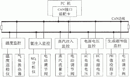 反应器中的烟气流量、SO2浓度、烟气温度、氨注入量、蒸汽注入量、交直流叠加电源电压、生成液PH值和生成液摩尔浓度等都直接影响系统的运行状况,利用相应的检测仪可对各参数的状态进行采集,而主要的监控回路包括氨注入监控、交直流叠加电源电压监控、烟气温度监控、蒸汽注入监控和生成液PH值监控等。CAN总线凭借其突出的数据通信可靠性、实时性、灵活性和抗干扰性[2]而在本系统中得到应用。