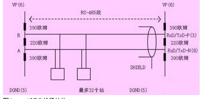 profibus-dp和profibus-fms采用rs-485传输技术。他们相同的传输技术和总线存取协议,可以在同一根电缆上运行。一个总线段内的导线采用屏蔽双绞电缆,段的两端各有一个终端器,rs-485总线段结构如图1所示。传输速率可在9.6kbts-12mkbts之间选用,所选用的波特率对连接到总线上的所有的设备都适用。每段最多连接32个站,通过中继器可以增加段数,则总线上的站最多可以连接126个。