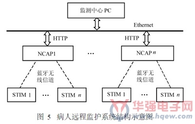 将上述网络化传感器(实验装置)用于病人监护中,病人就可以在异地(如家里)通过其身上携带的传感器来采集和检测某一信号,同时该传感器将信号通过Ethernet或Internet传送到监测中心。病人远程监护系统结构示意图如图5所示。
