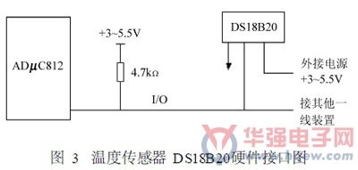 温度传感器选用的是DS18B20,该温度芯片是DALLAS公司生产的一线式数字温度传感器,主要由4部分组成:64位ROM、温度传感器、非挥发的温度报警触发器TH和TL、配置寄存器。ROM中的64位序列号是该DS18B20的地址序列码,ROM的作用是使每一个DS18B20都各不相同,这样就可以实现一根总线上挂接多个DS18B20的目的。主机控制DS18B20完成温度转换必须经过3个步骤:初始化、ROM操作指令、存储器操作指令。其工作流程是:初始化→ROM操作指令→存储器操作指令→数据传输,工作时序包括初始化时序、写时序和读时序。操作时必须先启动DS18B20开始转换,再读出温度转换值。其硬件接口如图3所示。