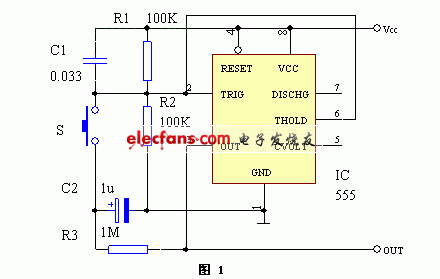 电路刚通电时,C1的存在使IC(555)⑥脚获得一正脉冲,其③脚输出低电平,此时C2上无电压。按一下轻触键S,C2上“0”电平作用于IC的②脚,③脚翻转为高电平,通过R3对C2充电。S释放后,C2充电到Vcc,而IC的②、⑥脚被R1、R2偏置于1/2Vcc,③脚高电平状态保持不变。再按一下S,C2上电压使IC⑥脚电压大于2/3Vcc,③脚又翻转为低电平。S释放后,C2上电压通过R3、IC③脚放电,②、⑥脚的电压仍为1/2Vcc,③脚低电平的状态可维持不变。由此可见,每按S一次,IC③脚高、低电平就变换一次。